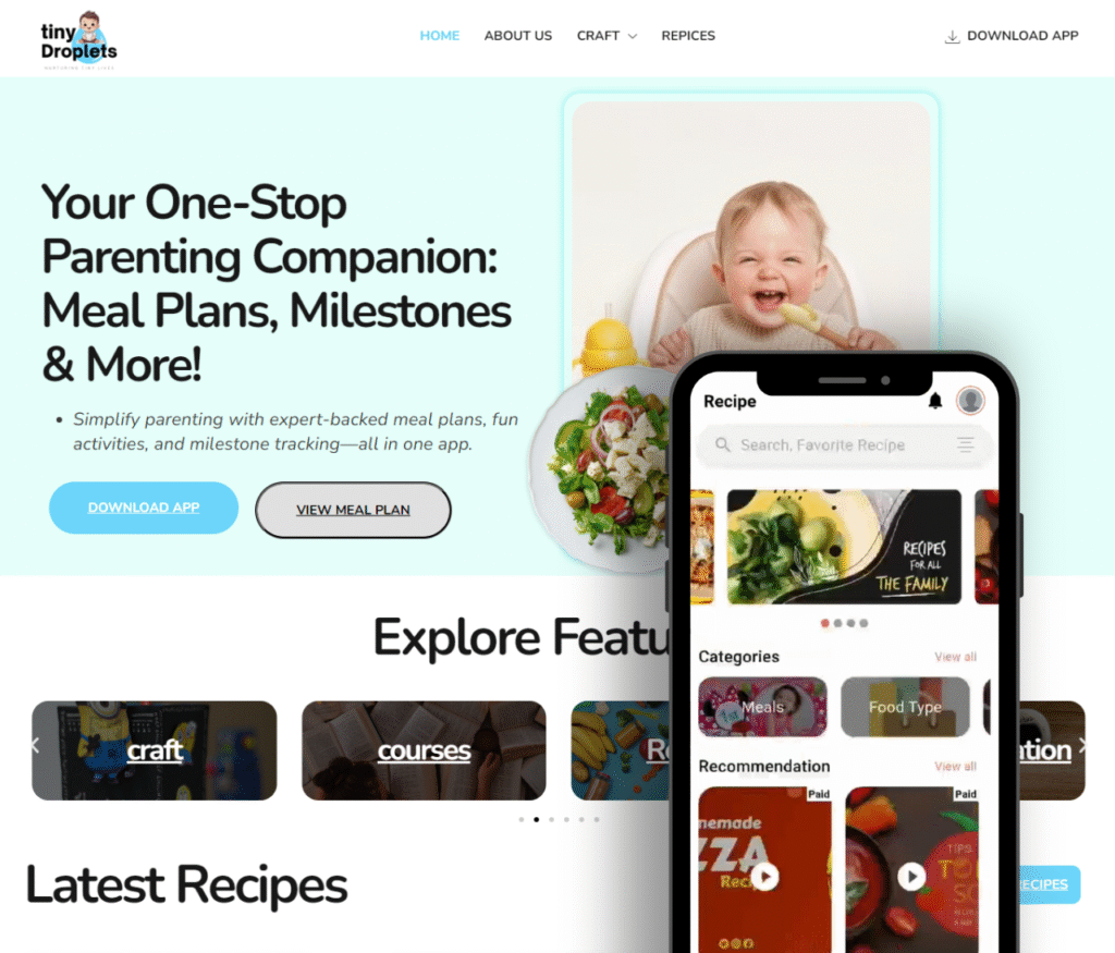 We created TinyDroplets, a beautiful and nurturing digital platform dedicated to helping parents find the right nutrition and meal plans for their babies. The project included both a mobile app and a website, offering a seamless experience for parents to explore healthy baby recipes, personalized diet charts, and growth tracking tools — all in one place.